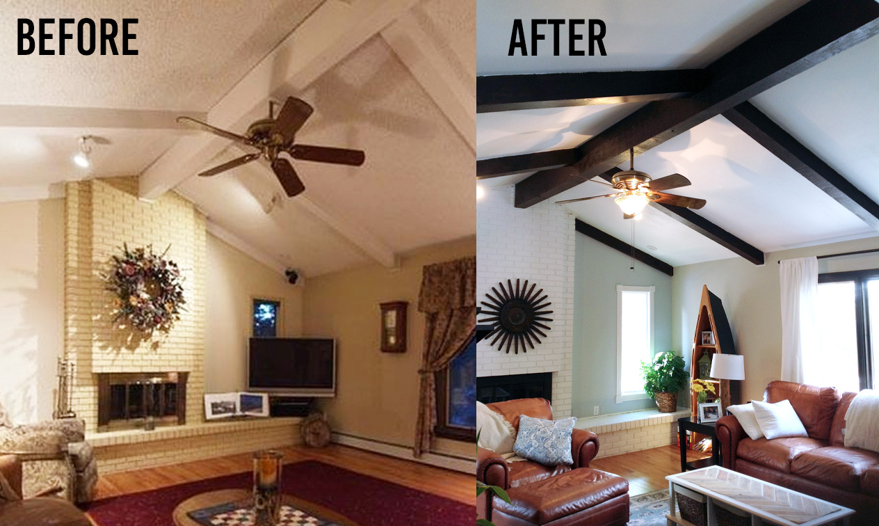 Stained or natural wood beams below or against a white vaulted ceiling can read as cozy, kitsch, woodsy or homey.